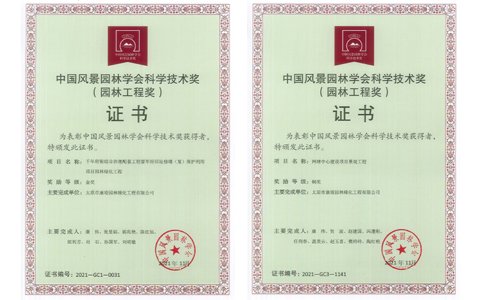 近日,集團子公司康培園林收到了中國風景園林學(xué)會的獲獎證書,該公司施工的“千年府衙綜合治理配套工程督軍府舊址修繕(復(fù))保護利用項目園林綠化工程”榮獲2021年中國風景園林學(xué)會科學(xué)技術(shù)獎園林工程獎金獎,填補了山西風景園林行業(yè)國家級金獎的空白。同時,該公司“網(wǎng)球中心建設(shè)景觀工程”施工項目獲得銅獎。